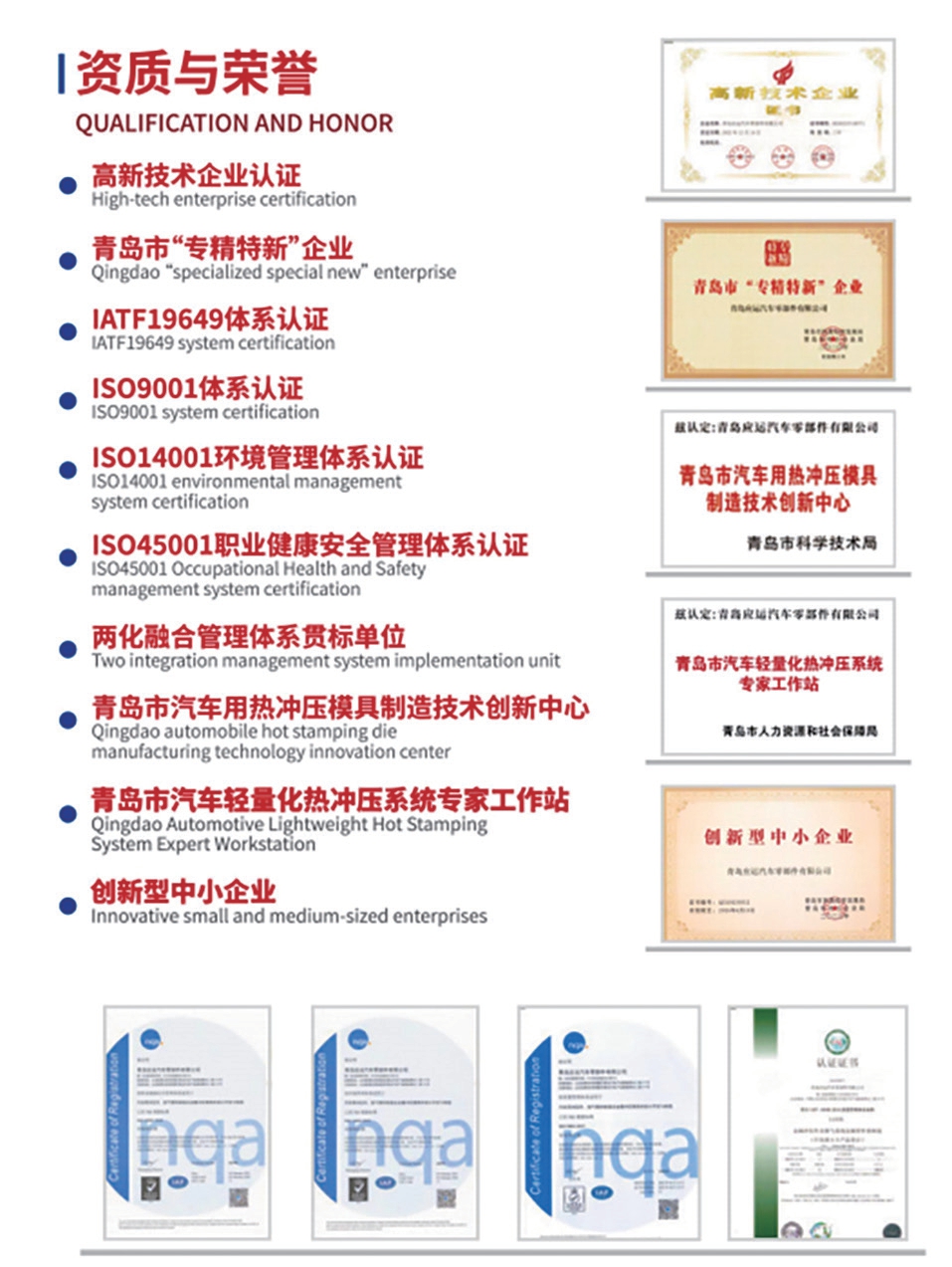 凭借卓越的技术实力、产品质量与服务水平,青岛应运获得了众多行业认证与荣誉,成为企业发展的坚实背书。青岛应运相继通过ISO 9001、IATF 16949、ISO 14001、ISO 45001等体系认证,获评青岛市“专精特新”企业、高新技术企业、创新型中小企业;先后获得青岛市模具行业协会颁发的“技术创新突出贡献单位”“标准化建设优秀企业”等称号,获批“青岛市汽车用热冲压模具制造技术创新中心”“青岛市汽车轻量化热冲压系统专家工作站”;通过两化融合管理体系贯标,成为全国机械行业先进制造领域产教融合骨干企业。